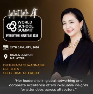 Dr. Thirada Suwannasri Honored at the 34th World School Summit for Advancing Global Education Collaboration Warmest congratulations to Dr. Thirada Suwannasri, President of SBI Global Network / SBI Group, for being honored as a Featured Awardee at the 34th Edition of the World School Summit (WSS 34th Edition) held in