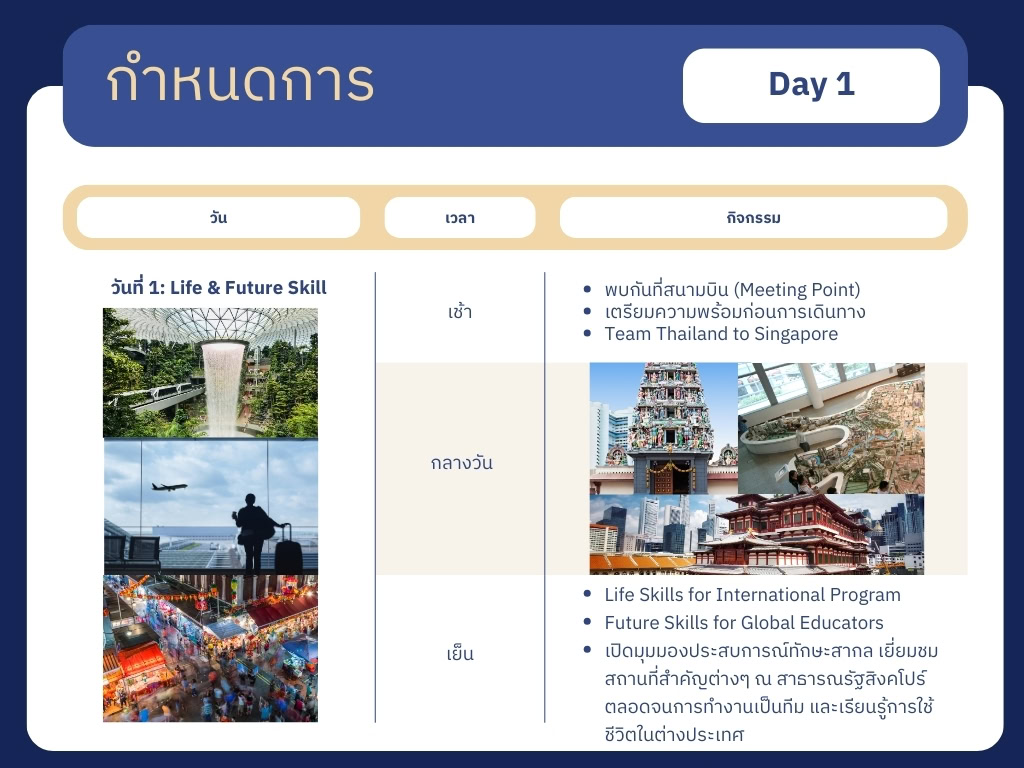 - โครงการนำเสนอวัฒนธรรม ทัศนศึกษา และเรียนรู้ทักษะชีวิตในต่างประเทศ (ทัศนศึกษาแหล่งท่องเที่ยววัฒนธรรม และพิพิธภัณฑ์) ค่าใช้จ่ายดำเนินการ 29,990 บาท (จากราคาเต็ม 55,000 บาท) พร้อมใบประกาศจากสถาบันการศึกษาสิงคโปร์