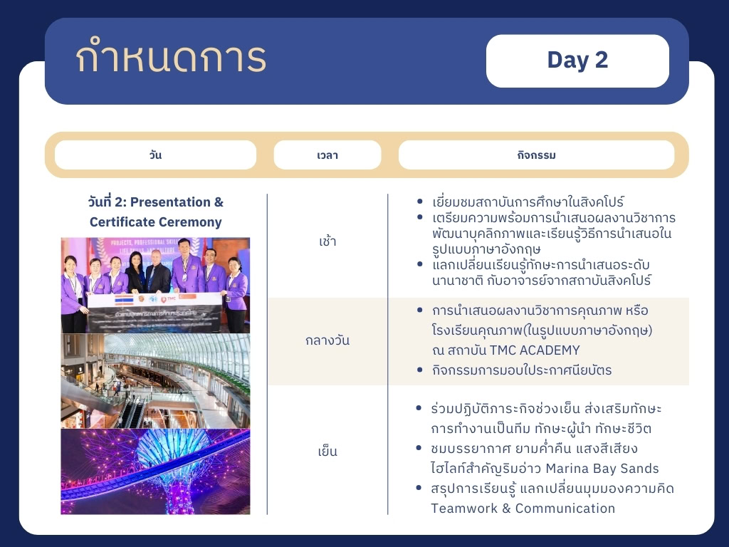 โครงการนำเสนอผลงานวิชาการ หรือผลงานโรงเรียนคุณภาพ สำหรับบุคลากรทางการศึกษา คณะครูอาจารย์ และผู้บริหารสถานศึกษา เพื่อร่วมคัดเลือกเป็นตัวแทนนำเสนอผลงานวิชาการ หรือโรงเรียนคุณภาพ ตลอดจนเปิดมุมมอง แลกเปลี่ยนองค์ความรู้ เสริมสร้างประสบการณ์ระดับนานาชาติ พร้อมกิจกรรมพัฒนาศักยภาพ ภาวะผู้นำ และวิสัยทัศน์การศึกษาศตวรรษที่ 21 โดยทีมวิทยากรชาวต่างชาติและชาวไทย ณ สาธารณรัฐสิงคโปร์