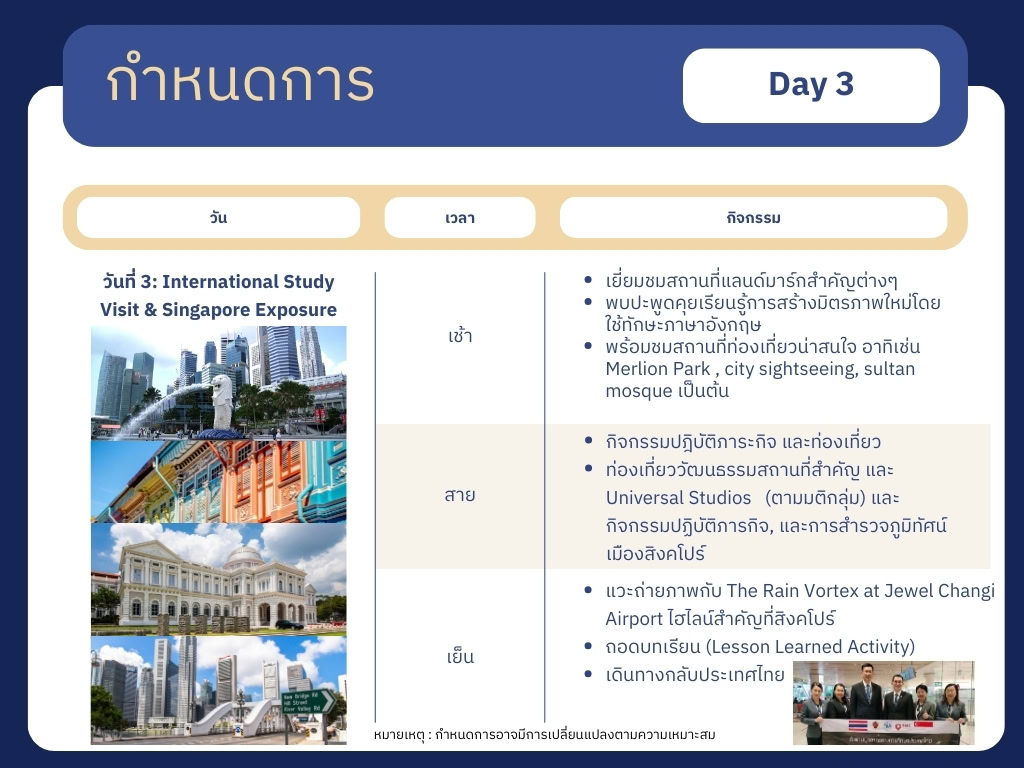 - การสร้างเครือข่ายกับครู ผู้บริหาร และนักวิชาการจากหลากหลายสถาบัน และรู้จักคณาจารย์ในสิงคโปร์